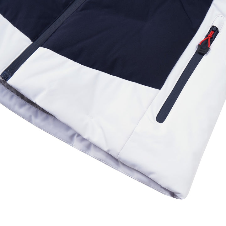 - Pockets: "Chest pocket with a water-repellent zip Two front pockets with water-repellent zips Ski pass pocket on the sleeve Internal zip pocket Large internal mesh pocket Lined hand warming pockets"