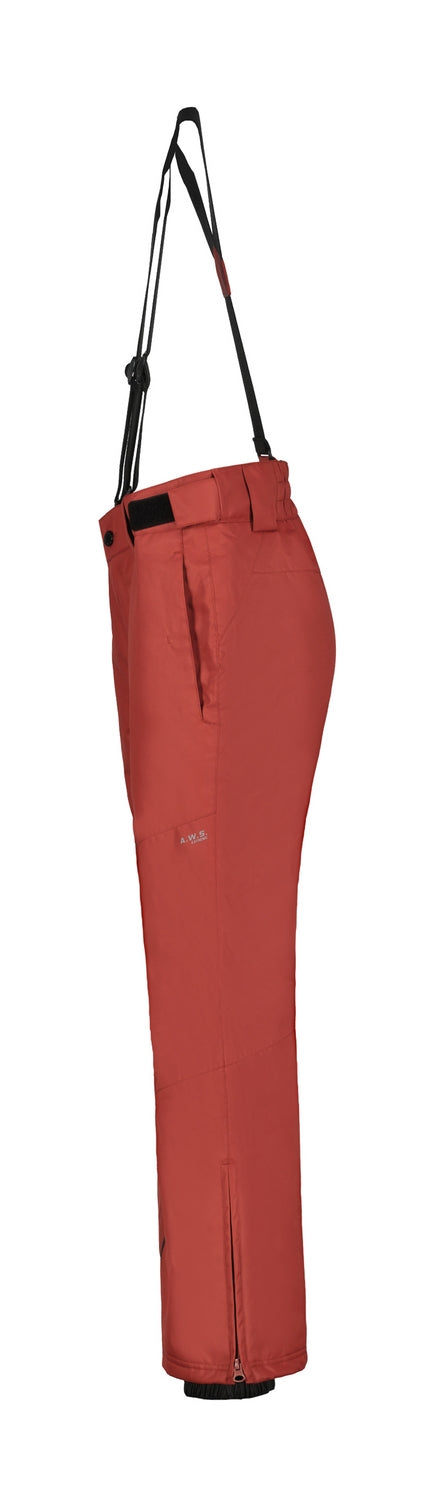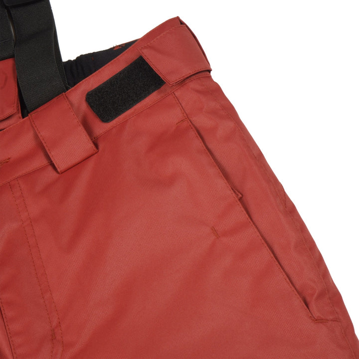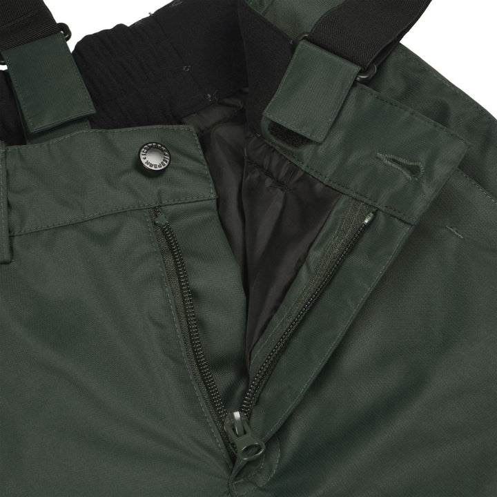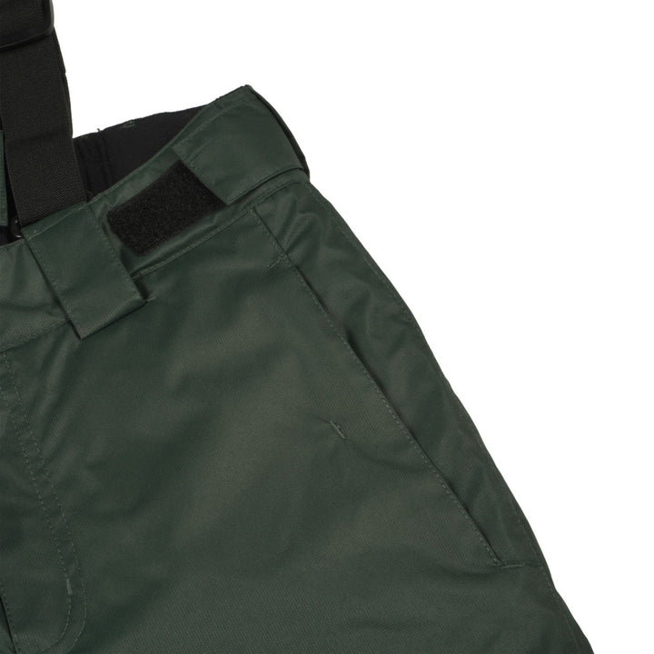 - : "Articulated knee construction Elastic waist Adjustable waist Adjustable suspenders Fixed snow gaiters in the leg openings Zips at leg bottoms Reinforcements at leg bottoms Fully taped seams PFC-free"