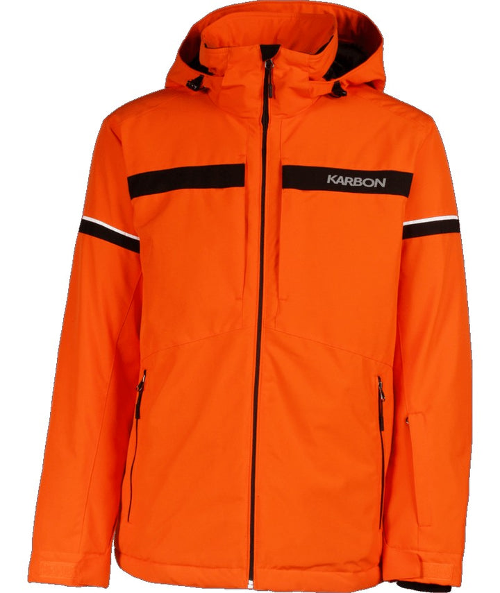 - Pockets: "Removable, adjustable, insulated hood Alouva lined collar Adjustable wrists with velcro tabs Underarm mesh-lined venting Snow skirt with snap closure, gripper elastic, inner stretch cuffs Inner ID label Embossed lining Embroidered Karbon logo Seam sealed Karbon D-ring Karbon goggle wipe Key clip Contrast details Exposed center front zipper Full wind flap with integrated chin guard"