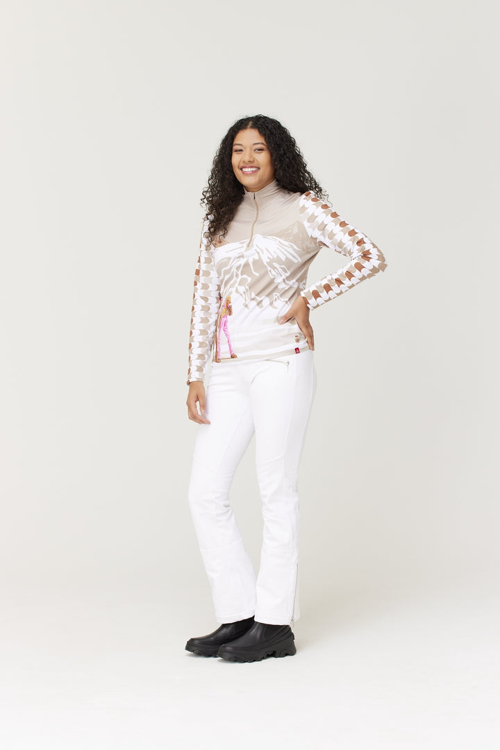 The Mountain Groove Top is the perfect addition to your ski outfit. This quarter zip midlayer is moisture wicking and 4-way stretch recycled polester/spandex. It's sure to be comfy under any coat. Youll be rocking this piece in the sun at Apres with 50+ UPF rating. The soft mid-weight, brushed ultra-soft interier is surely comfy alone.
