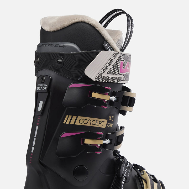 The Suspension Blade technology connects the upper and lower cuffs for smooth power transfer and confidence through every turn on the mountain. With a women's-specific cuff and customizable liner, as well as a roomy Comfort Last, the Concept 8.5 boots strike the perfect balance between fit and performance, allowing you to stay focused on the fun of skiing. The 85-rated flex of these boots is designed for intermediate skiers who prioritize all-day comfort, with the added bonus of a simple adjustable insert on the cuff that allows you to soften the flex by 8%. The 103mm Comfort Last ensures a relaxed fit with plenty of room for different foot shapes, providing all-day support and maximum comfort on the slopes.Dual Core technology blends hard and soft plastics to enhance power transmission, boot flex, and overall response, resulting in better control and fit for the skier. The women's-specific cuff and liner are tailored to match the natural shape of a woman's foot and calf, maximizing comfort and performance while skiing.The EASY Closure System features an intuitive three-buckle closure with a single buckle on the shell for easy adjustment and all-day comfort. Additionally, the Easy Entry and Exit design, combined with the passive hinge channels in the lower shell and Comfort Profile Tongue, ensures an easy, no-hands-required entry and exit experience for added convenience. Overall, the Lange Concept 8.5 ski boots offer maximum comfort, all-day support, and better skiability for intermediate skiers, all while prioritizing fit, performance, and enjoyment on the mountain.Style: LBO6250