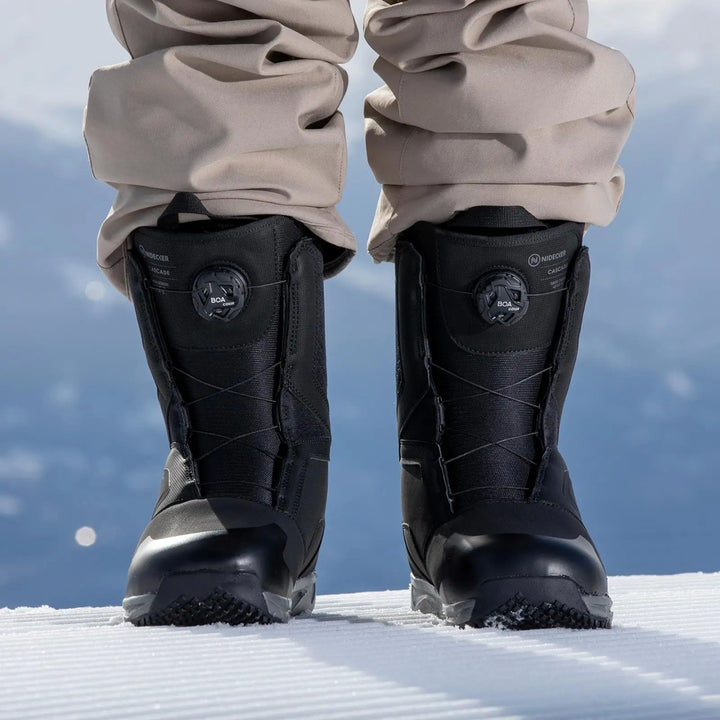 One of the standout features of the Cascade boot is its heat-moldable liner, which ensures a custom fit for maximum comfort. The Gravity+ outsole is the lightest in the lineup, offering a tread pattern inspired by snowcats for superior traction. The rubber toe-tip adds an extra level of grip, making it easy to navigate through tricky terrain.The full-length EVA cushioning provides protection on rough trails and helps absorb impact during park landings, while the upgraded 3D-molded toe box with TPU reinforcement keeps your feet warm and dry in all weather conditions. The forgiving yet durable construction of the Cascade boot means it will last for years, making it a smart investment for any snowboarder looking to progress their skills on the mountain.Style: N.25.BTM.CSC.BK Features for the Cascade Snowboard Boots Warranty: Nidecker snowboards are backed by a full two-year warranty against manufacturer's defects that can be expanded to three years simply by registering your new board. Nidecker TheNeidecker approach to business is simple: progress guided by la technique créative and respect for the environment. Innovation is a key part of the company's DNA, influencing their designs, technology, and communication. Throughout the decades, Nidecker has evolved but remained dedicated to their passion for la glisse: gliding on snow and water.