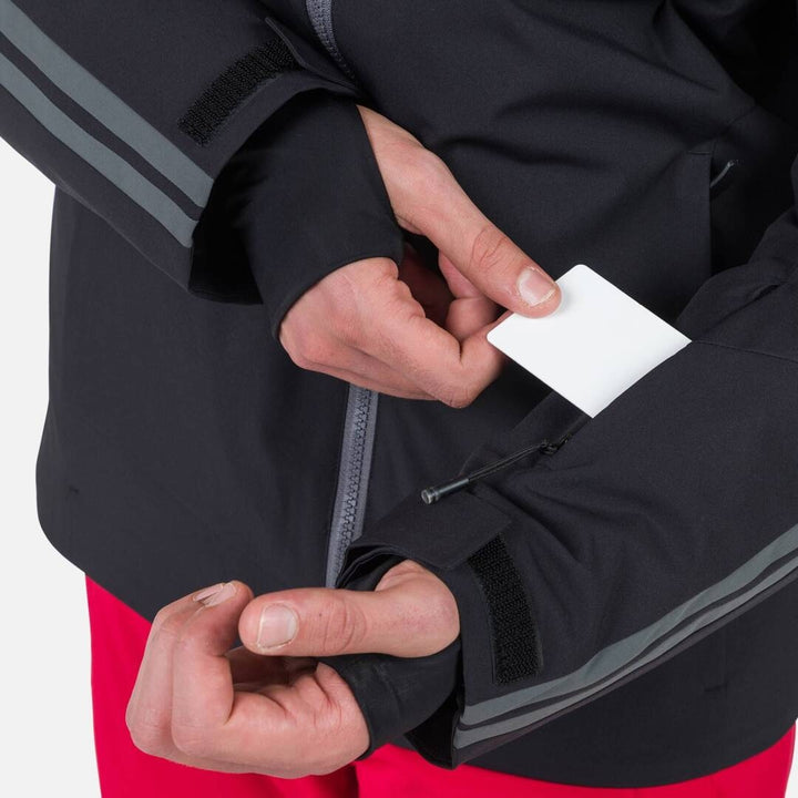 - : "Critical Sealed Seams Hood : Adjustable and fixed - Hidden inside collar - Helmet compatible Clothing - FF - Cuff : Stretch with thumb loop + placket cuff adjustement Powder : Fixed in Coated nylon with anti-slip silicone Adjustments : Elastic cord on bottom Artwork : ROSSIGNOL print on back"
