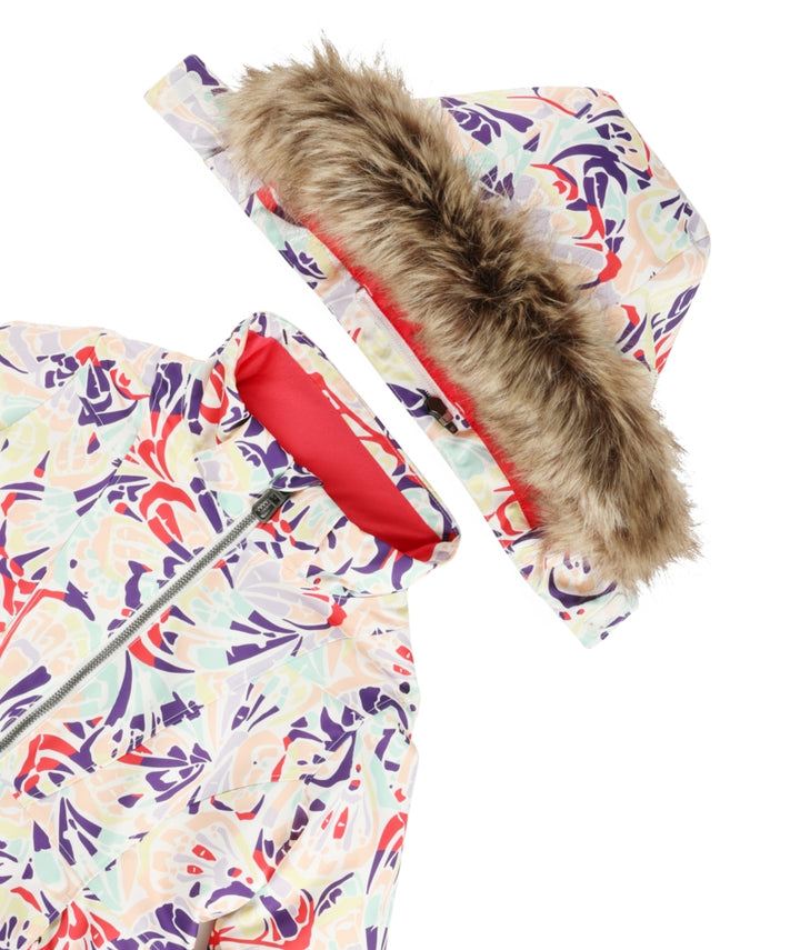 - Feature Callout: "Removable helmet compatible hood with inner hood gaiter and detachable faux fur trim Fixed powder skirt with gripper elastic Elasticized cuffs with glove/mitten attachment"