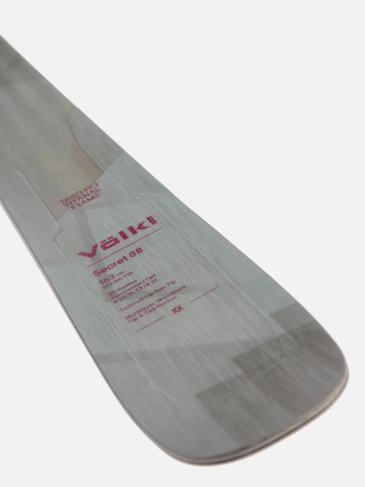 For those who want a ski that can handle both piste and powder, moguls and groomed slopes, the Secret 88 with its updated design is the ideal choice. This all-mountain freerider is perfect for female skiers who prioritize performance but don't want to be limited to one type of terrain. The 3D Radius Sidecut with three different radii allows for impressive carving performance by engaging different parts of the ski at varying speeds, turns, and terrains. The tip and tail rocker make turning easier and forgiving on challenging slopes. The Tailored Carbon Tips and Tailored Titanal Frame ensure the perfect ride on all lengths, with the frame adjusting torsional stiffness and damping based on ski length. Carbon fibers in the tips influence curve behavior accurately, allowing for agile turn initiation. The ski is lightweight yet stable, with a multilayer wood core, full sidewall, and P-Tex 2100 base. Suitable for skiers looking for versatility and high performance on any mountain terrain.